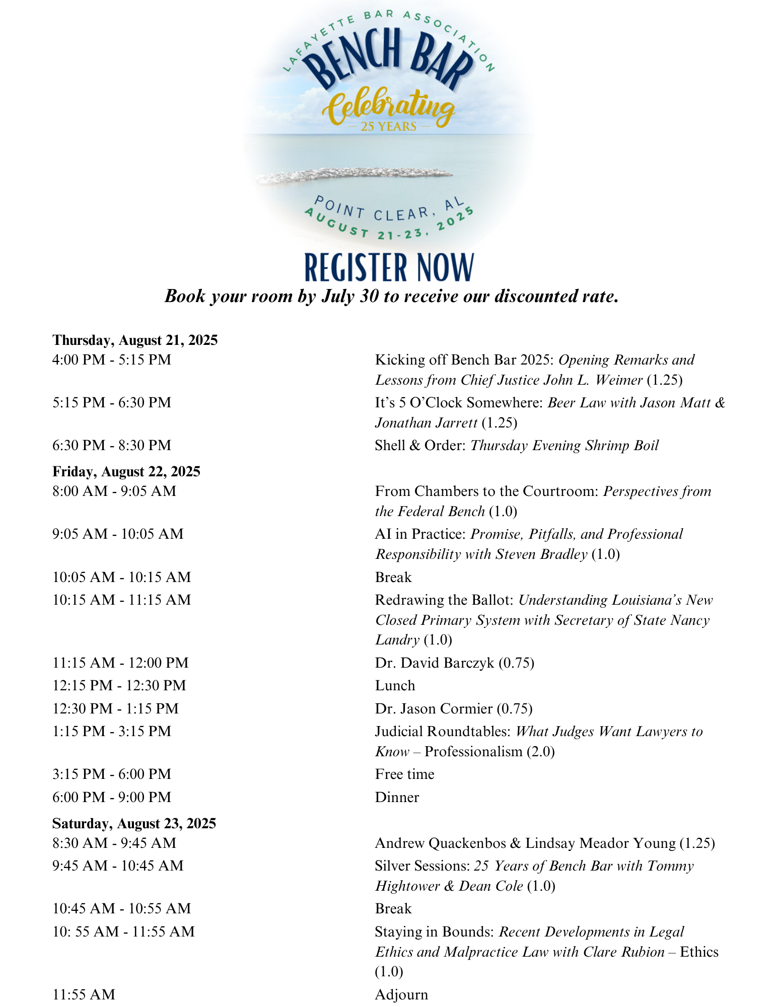 Join us as we celebrate the 25th anniversary of Bench Bar which will take place Thursday, August 21st through Saturday, August 23rd at the Grand Hotel Resort & Spa in Point Clear, AL! The Bench Bar Conference has always been an exciting and entertaining way to gather with members of the judiciary, obtain mandatory CLE hours and network with colleagues and non-member organizations. This year's program will offer an excellent lineup of CLE topics and speakers.