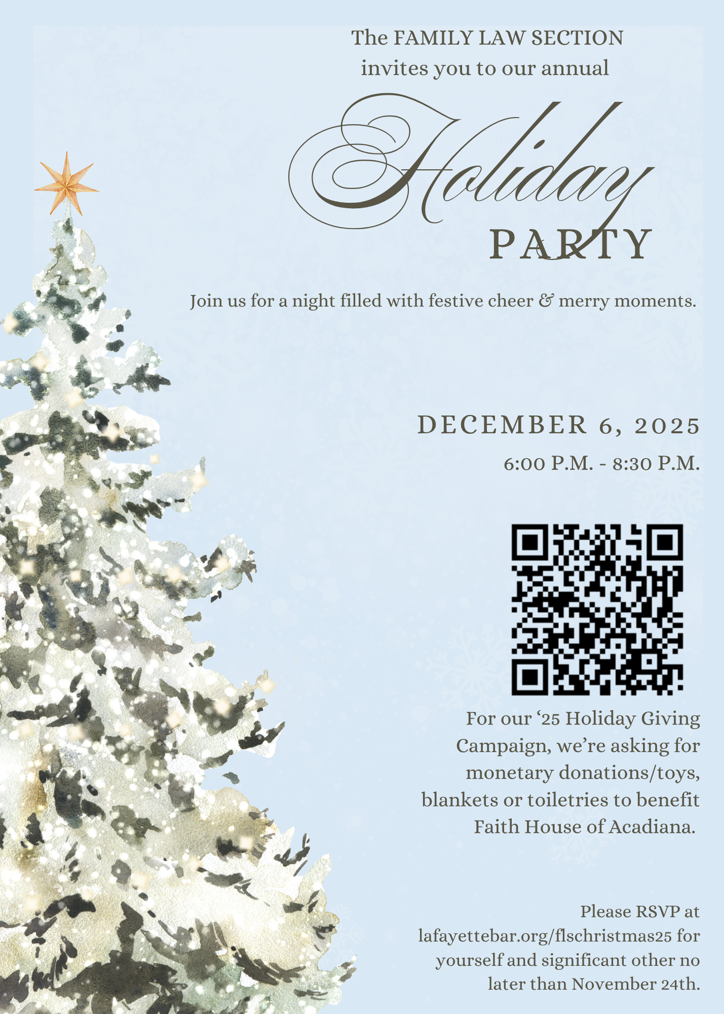 All Family Law Section members are invited to join us for the FLS Holiday Party on Saturday, December 6th, 2025. The party will be held from 6:00 PM til 8:30 PM. There will be food, drinks, and fun. We look forward to getting into the holiday spirit with all of you. Please contact Jordan Lippencott at [email protected] or call her at (337) 446-2203 if you have any questions. Click here to RSVP for the event. Click here to Donate to Faith House of Acadiana We kindly ask that you RSVP by 5:00 PM, Monday, December 1st. Contact: [email protected] |