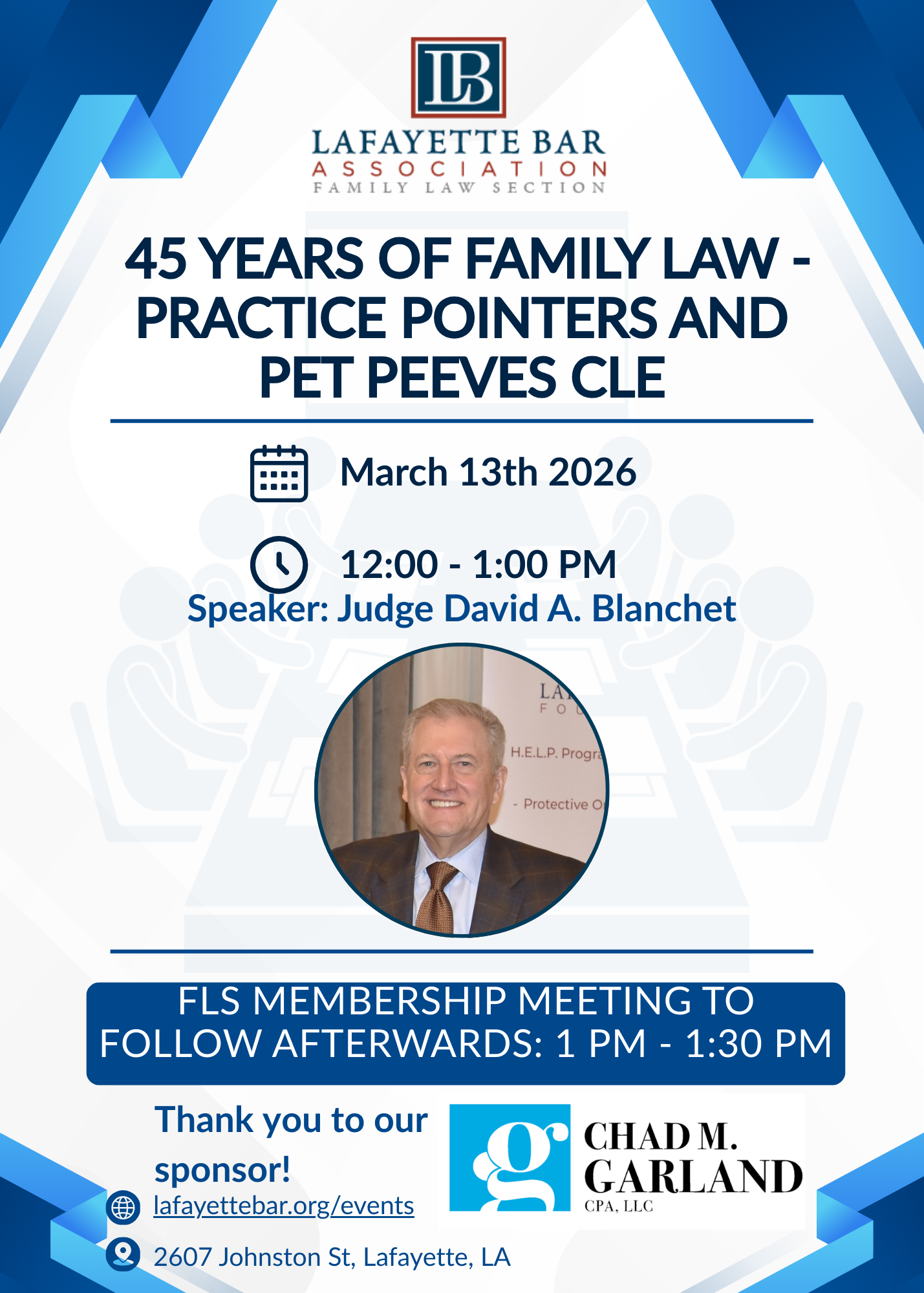 ![]() The Family Law Section is excited to remind our section members of our March 13, 2026 1 hr. CLE. The Section is holding a 1.0 hour CLE from 12 PM to 1:00 PM with a membership meeting to follow at the Lafayette Bar Association office.